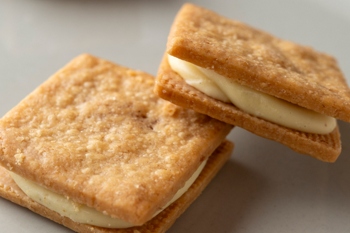 サブレ生地は、ココアと全粒粉入りのプレーンの2種。どちらにも黒糖を使用しています。溶け残る黒糖が、ガリッとした食感のアクセントとなり、噛むごとに優しい甘みが感じられます。